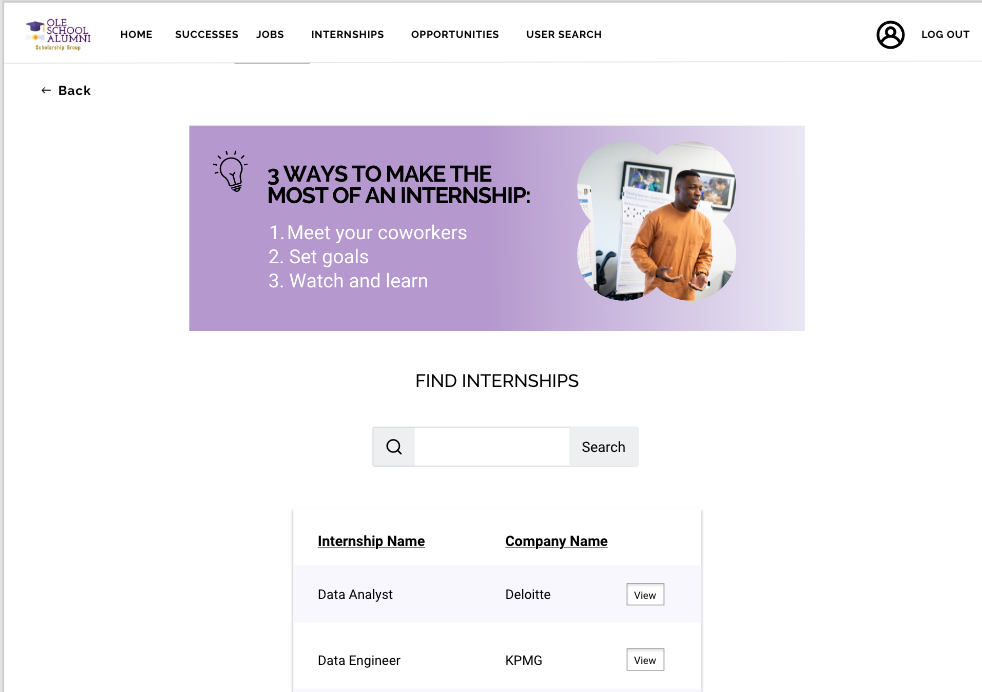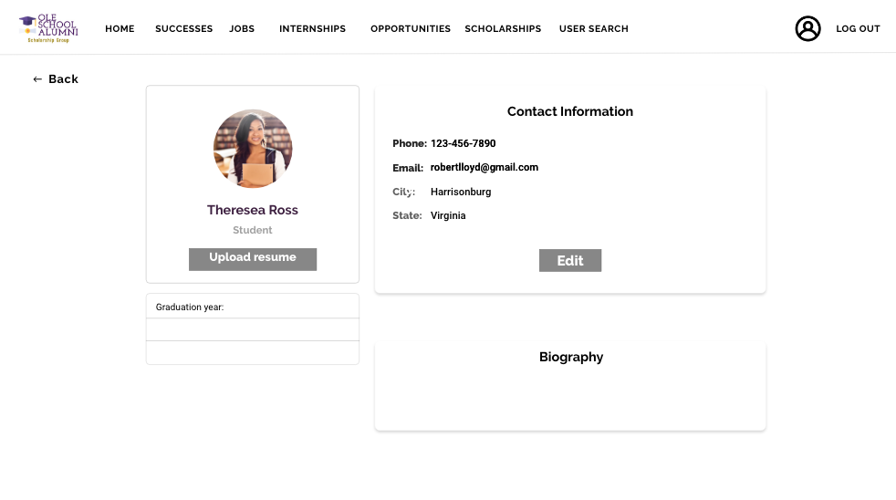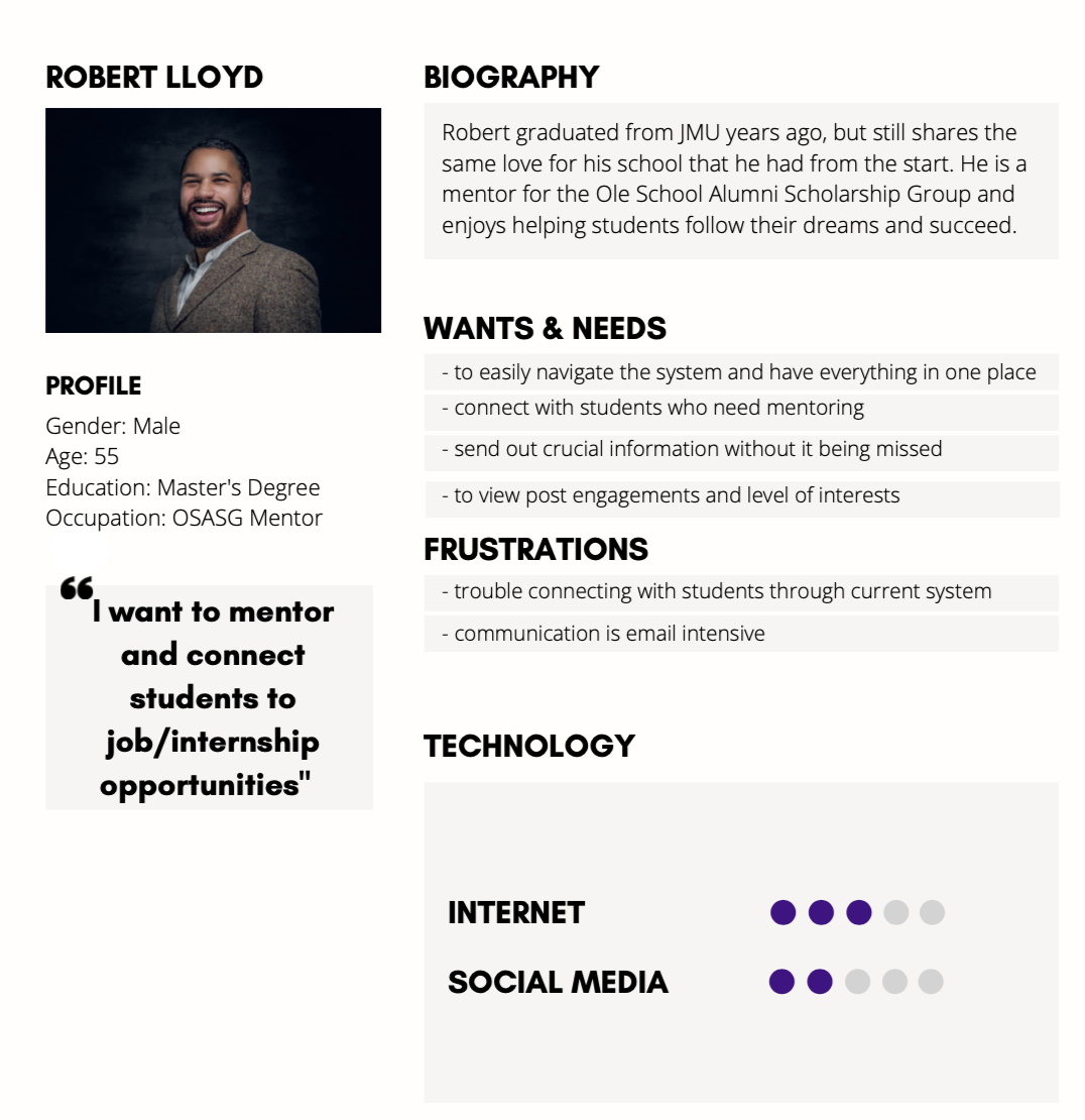 For my senior project my team members and I worked with the client The Ole School Alumni Group. The goal of the project was to create a system that connected students to mentors and scholarship opportunities. The Ole School alumni Group works with underepresented students at James Madison University to connect them to opportunities and even grant scholarships